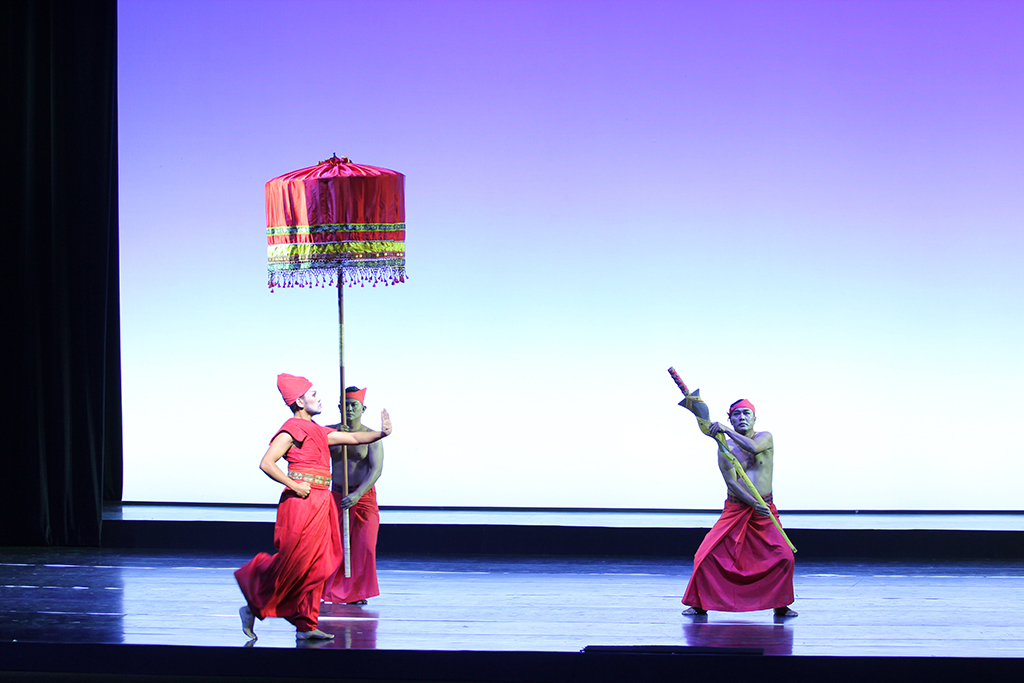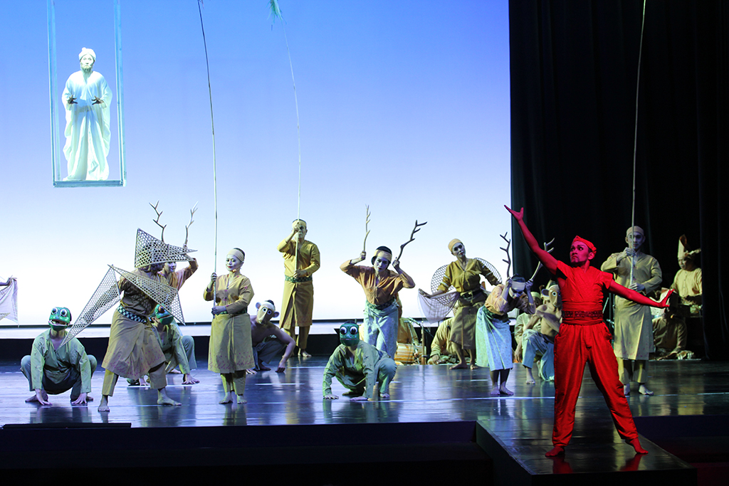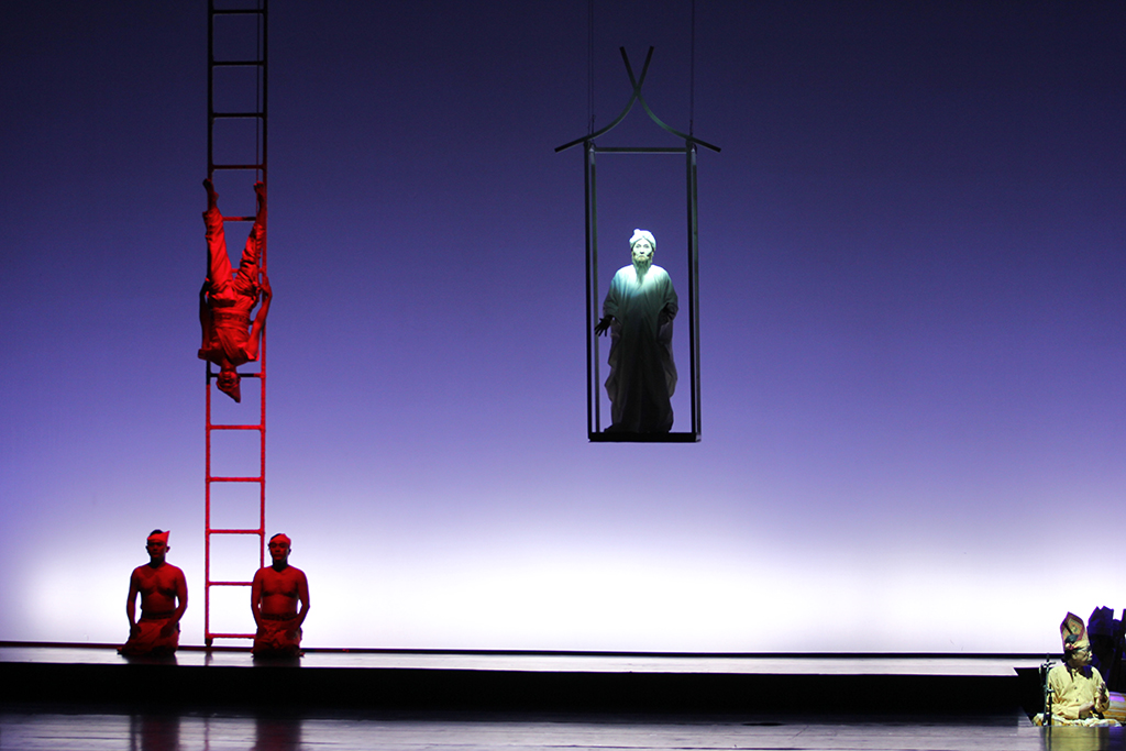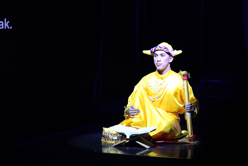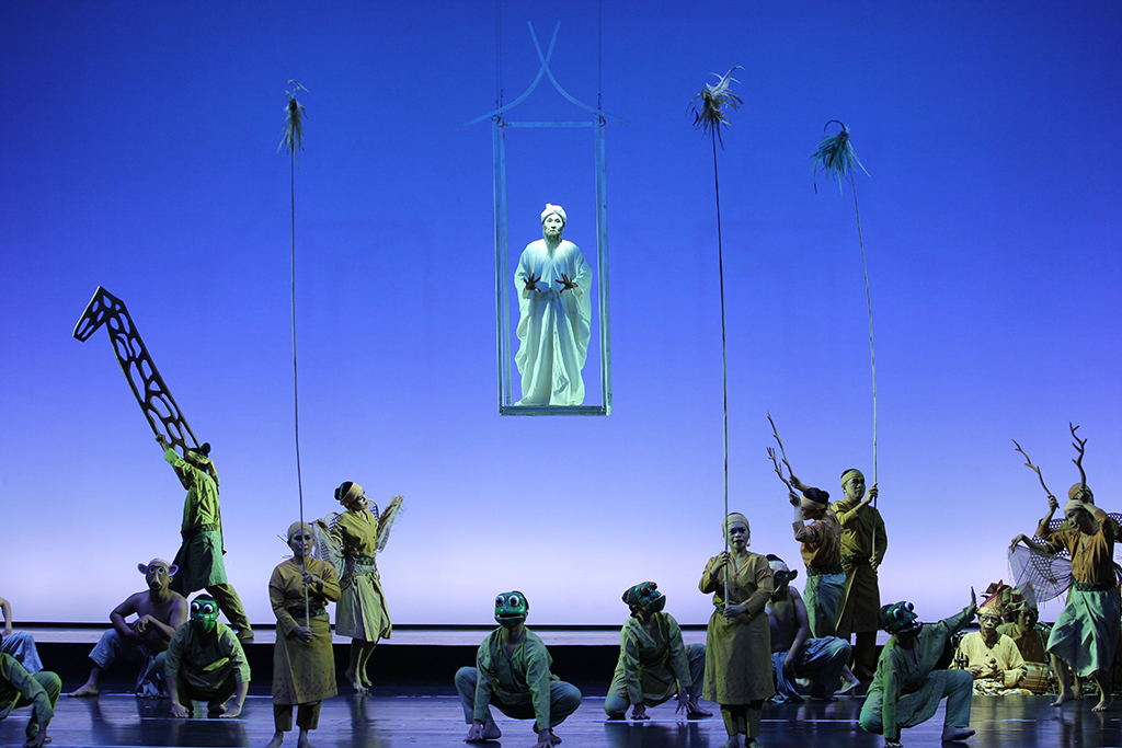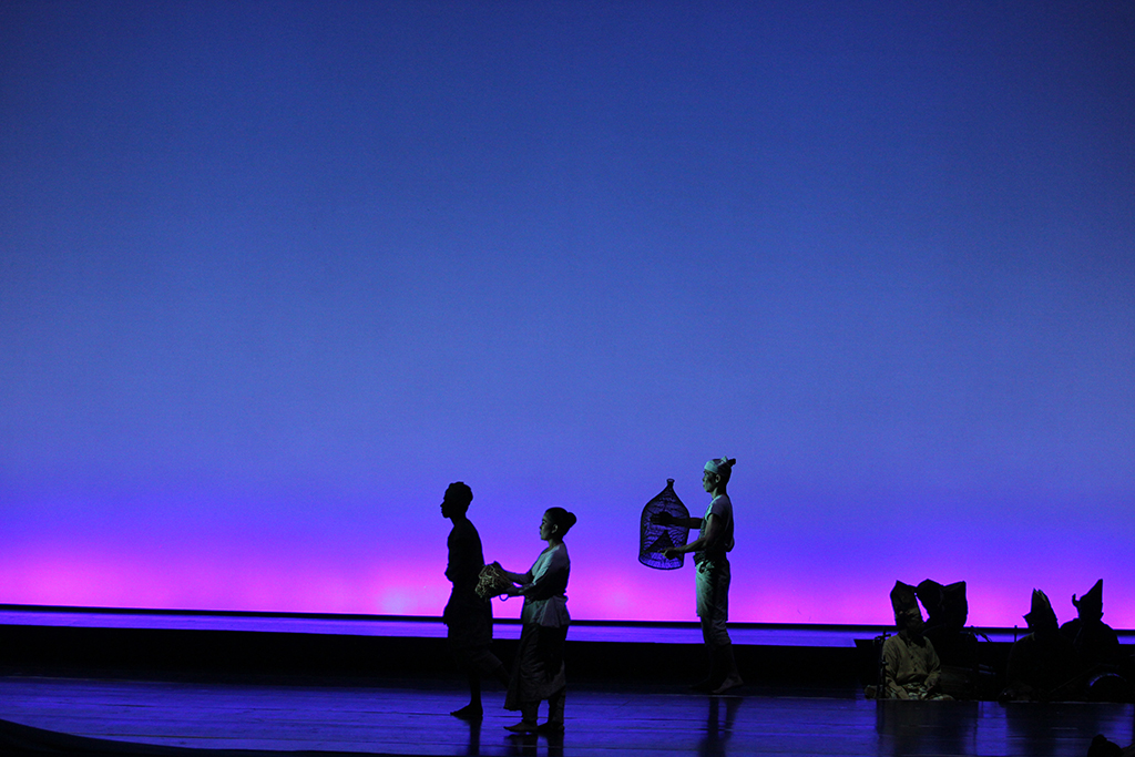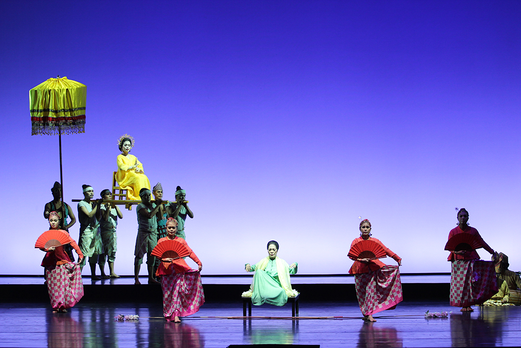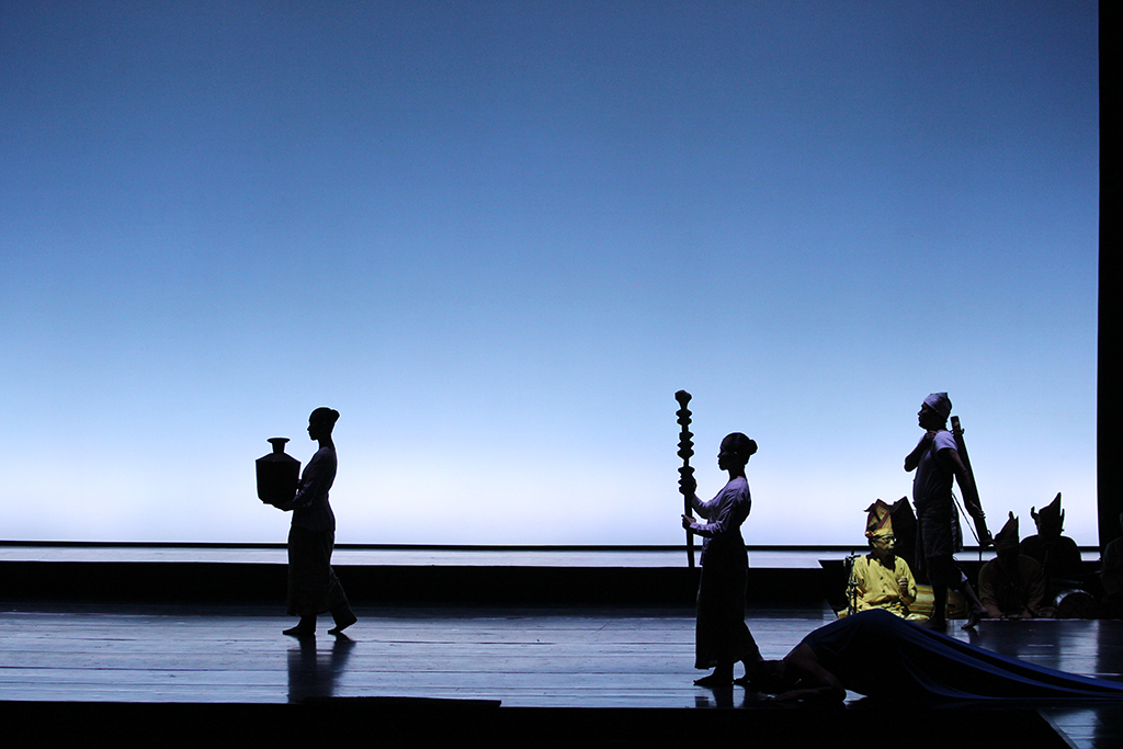 Out of the vast material in Sureq Galigo, that covers the story of a so-called Middle World (that of humanity), the production focuses on one particular narrative thread, about the warrior Sawerigading, and his twin sister, We Tenriabeng. They are descendants of the gods of the heavens and the gods of the underworld who send their offspring to inhabit the earth. From the time in the womb of their mother, which is put onto stage, they are destined to fall in love with each other. Worried that their incest would doom the world, the Bissu priests order them to be separated at birth.