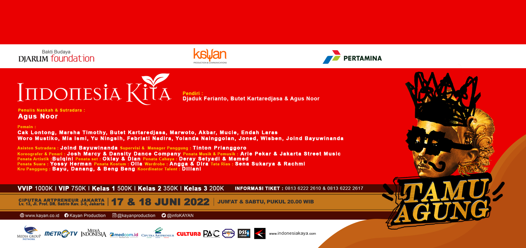 Tahun ini Indonesia Kita kembali tampil di panggung ibu kota. Sebuah pertunjukan yang menggabungkan seni teater, musik, dan tari yang digagas oleh seniman Butet Kartaredjasa dan penulis Agus Noor serta diproduksi oleh Kayan Production ini, akan menyapa publik Jakarta dengan lakon "TAMU AGUNG"